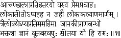 1. He who was Shri Rama, whose stream of love flowed with resistless might even to the Chandāla (the outcaste); Oh, who ever was engaged in doing good to the world though superhuman by nature, whose renown there is none to equal in the three worlds, Sitā's beloved, whose body of Knowledge Supreme was covered by devotion sweet in the form of Sita.