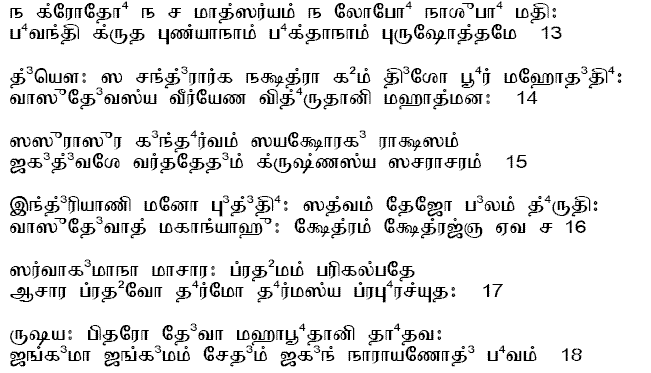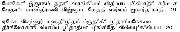 SrI Sa'nkara explains the word `aSesheNa' to mean `a-nyUna, an- atirikta' neither less, nor more, but exactly thousand nAma-s. The implication is that the choice of the thousand names by bhIshma are significant, and are not randomly chosen. SrI Sa'nkara also refers us back to one of the initial six questions kim japan mucyate jantuh (see Introduction for detailed meanings), and points out that these 1000 divine nAma-s are the ones that are the object of `japa' referred to therein. He points out that `japa' consists of three kinds - ucca, upAmSu, and mAnasa loud, whisper, or in the mind (trividha japo lakshyate uccaA, upAmSu, mAnasa lakshaNah trividho japah). The words prakIrtitam in the current Sloka answers that all three means chanting loudly, through a low tone, or by contemplating in the mind, can be used in singing His praise (kIrtana).