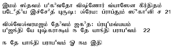 In this Sloka, the qualifications for reciting the stotra, and the result from recitation are declared in general terms. "Nothing inauspicious or unwelcome will accrue to that man in this world or in the world beyond, when one hears this daily or recites it".