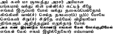 (5) AnkaNN iraNDum koNDu: Seeing with one eye or half eye (kaNN chimittal) generates base instincts (kaama VikAram).Hence , the Gopis pray for Him to look at them with both eyes like a caring Mother looking at her child with both eyes.This is the proverbial "VishNO: KatAksham".The Gopis remind Him that they are not there for half or one eyed glance that will lead to Madhana VikAram (Manmatha ChEshtai like in Raasakreedai ).They want the two eyes of the Lord like Moon ( cooling , comforting glance) and Sooryan ( Removal of the darknes of aj~nanam)to bless them for Moksham .
