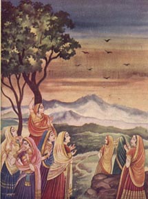 That very moment Krishna immediately disappeared under her and Radha Rani was left hanging on the branch. All the gopis came where Radha Rani was hanging from the branch of the tree and heard everything from her. They felt sympathetic about her and together, they proceeded in search of Krishna. When they were unsuccessful in their endeavor, they set down on the bank of River Yamuna and started chanting the glories of Krishna. They repeatedly requested Krishna to appear again. On hearing their plea, Krishna reappeared before the gopis and tried to pacify them.